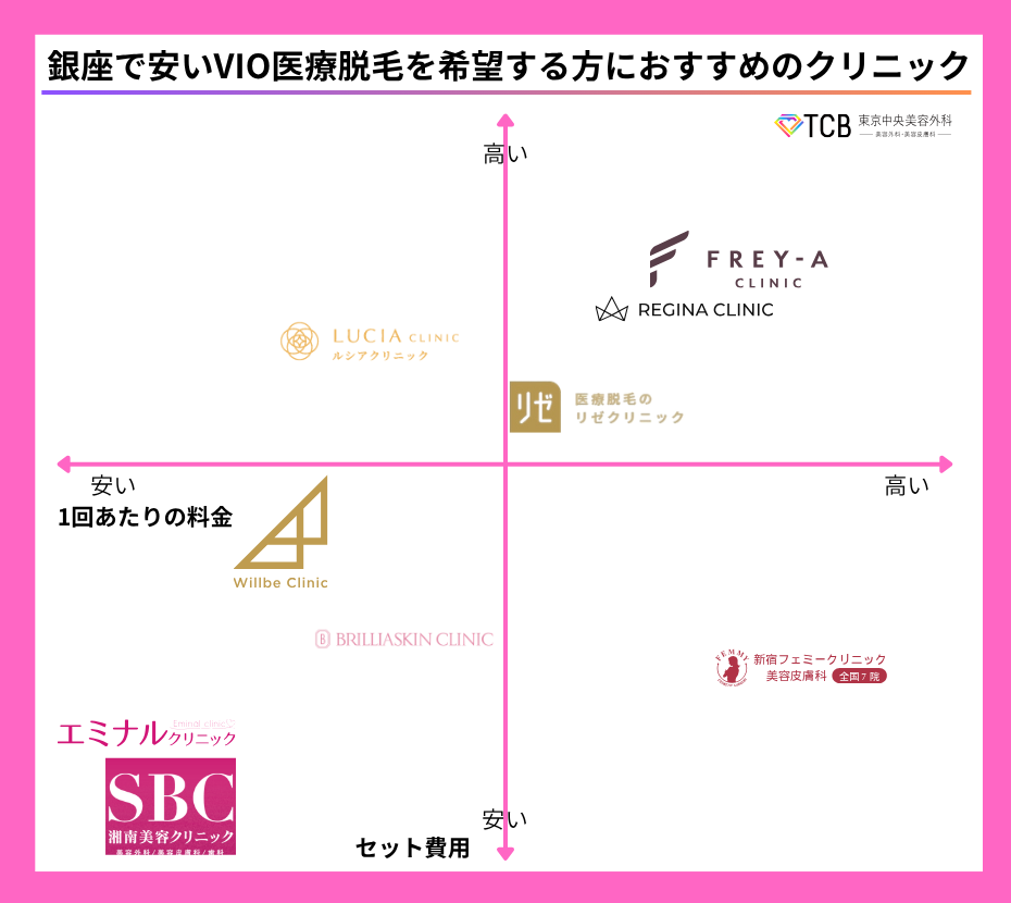 | 銀座での1回あたりのVIO医療脱毛セットプランの最安相場 | 8,250~24,300円(税込み) |